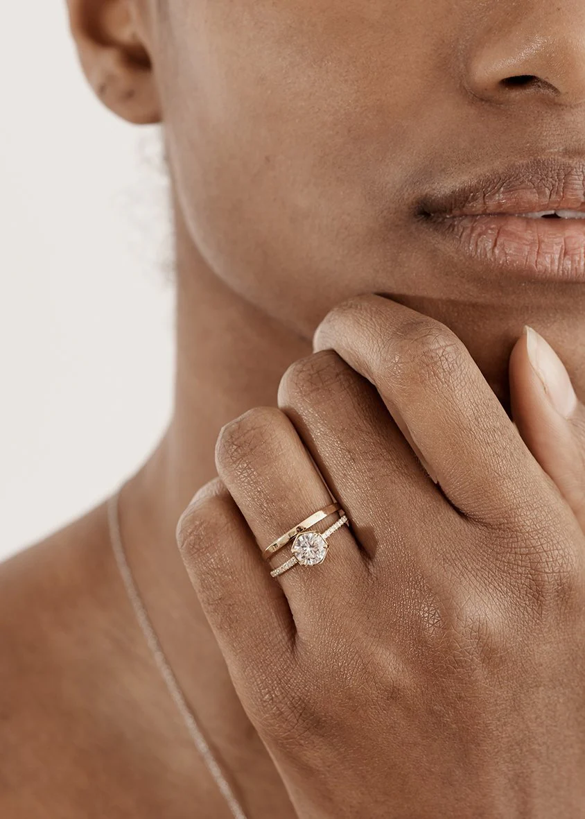 A variation on our classic Aquila Ring, the Aquila with Diamonds Ring features the same round brilliant cut white diamond in a hexagonal setting, but with added micropavé white diamonds set halfway across the band for extra flair.