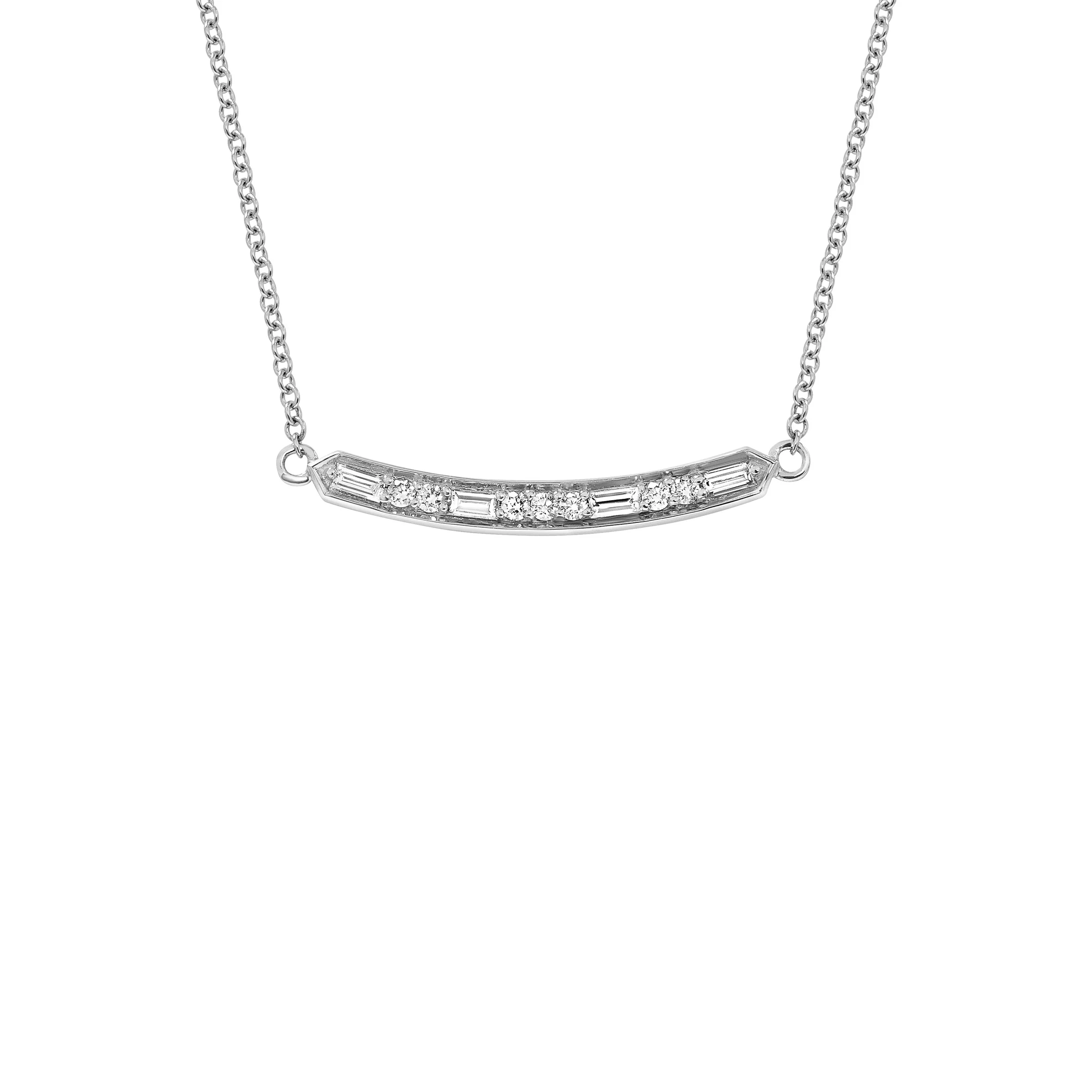 A delicate line of diamonds to sit just below the collarbone, inspired by our most-loved Baguette and Round Diamond Band.