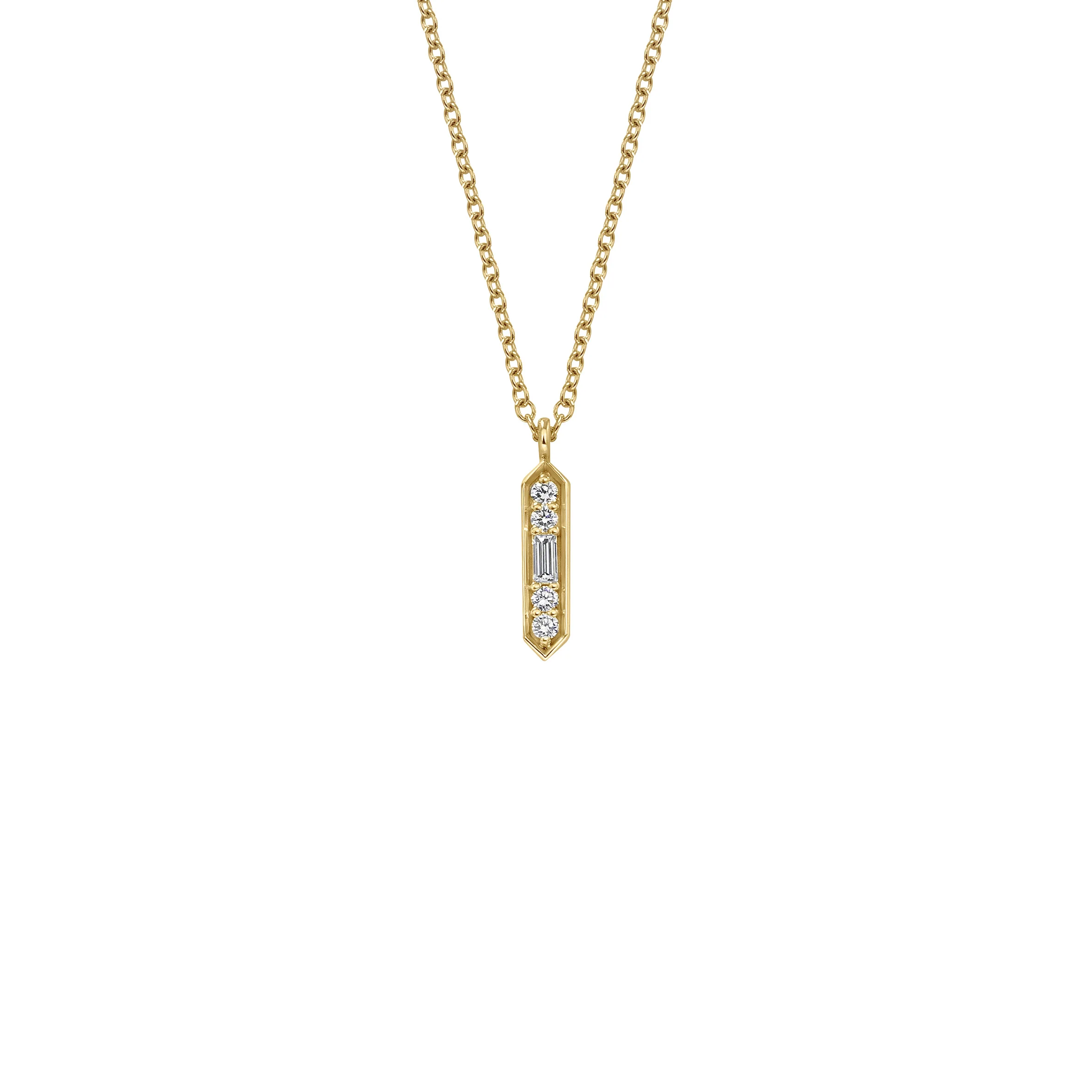 Inspired by the clean lines and geometry of Art Deco architecture, our Deco Pendant Necklace is set with ethically sourced Baguette and Round diamonds for a touch of luxury.