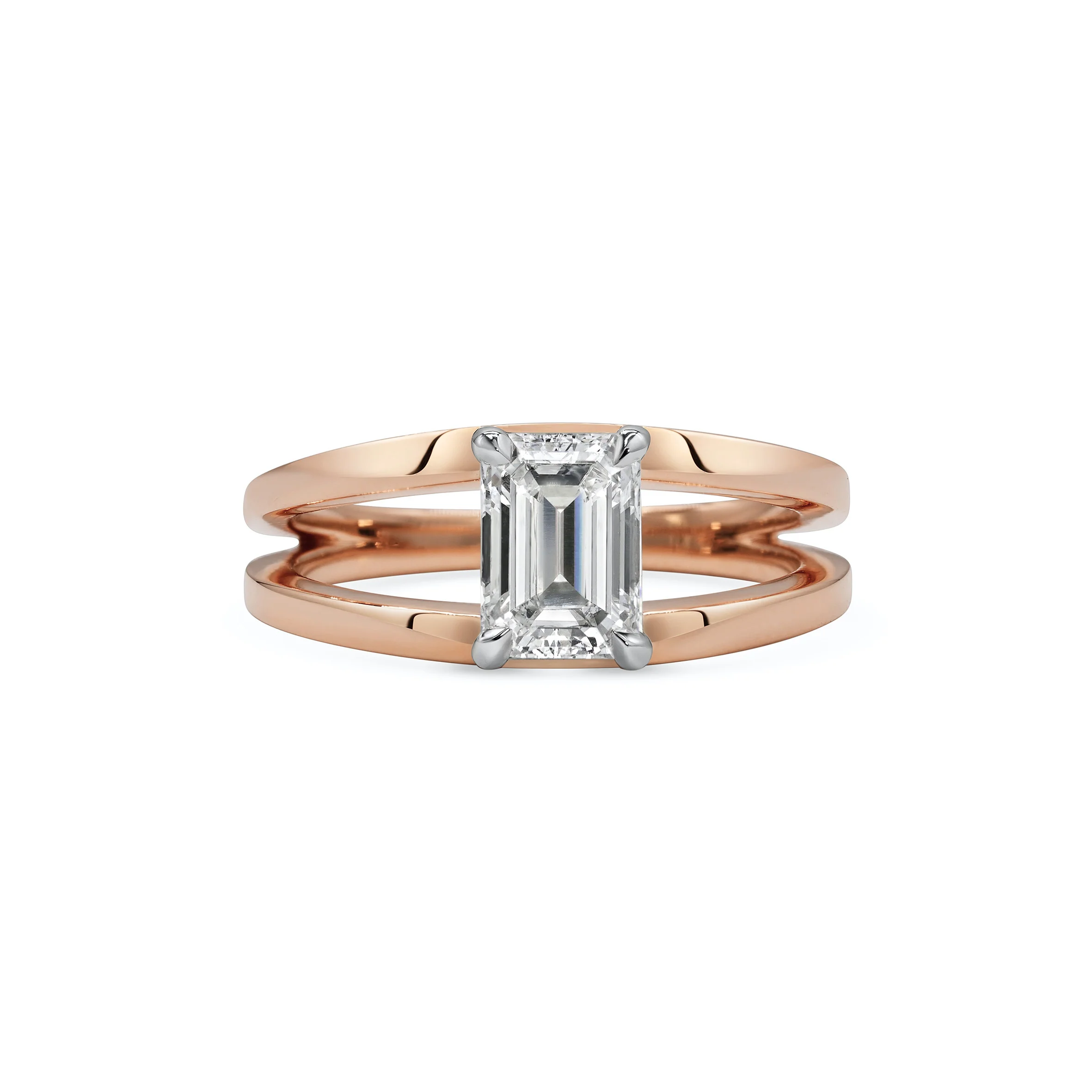 A design with clean, graphic lines, the Frances Ring features an emerald cut white diamond set into a platinum setting, atop a wide set double-band - simple yet striking.