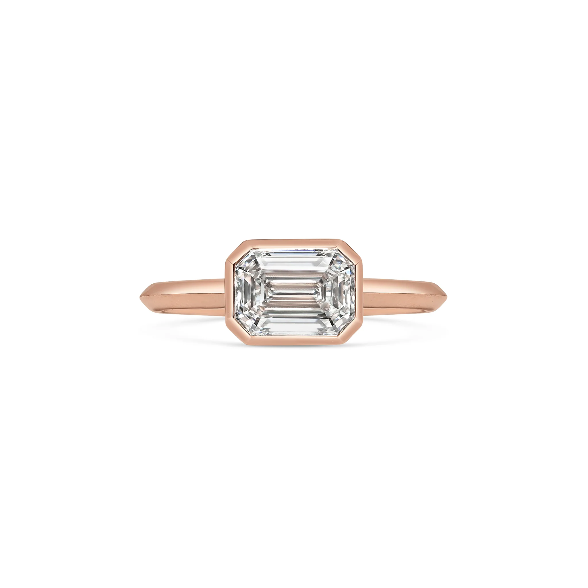 Proof that minimal needn’t be boring: the stylish Ines Ring features an Emerald cut diamond in a graphic rub-over setting on our signature knife-edge band.