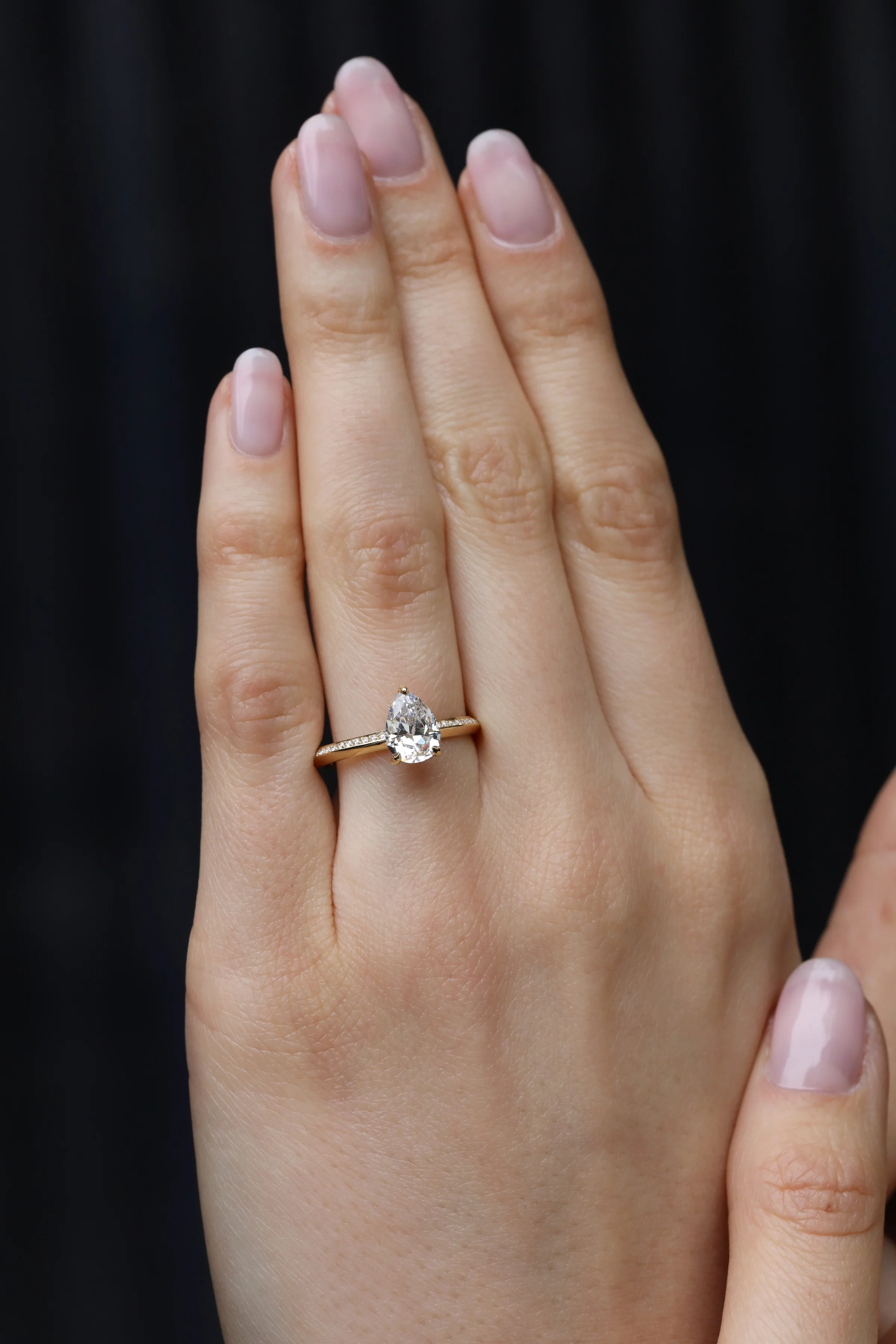 A pear cut diamond instantly makes a classic design feel different, as is the case with our Lyra Ring: a stylish white pear diamond solitaire on a knife-edge band with micropavé diamonds on half of the band. The perfect choice if you are looking for something a little bit more unique than a round or oval diamond ring, but that feels timeless nonetheless.