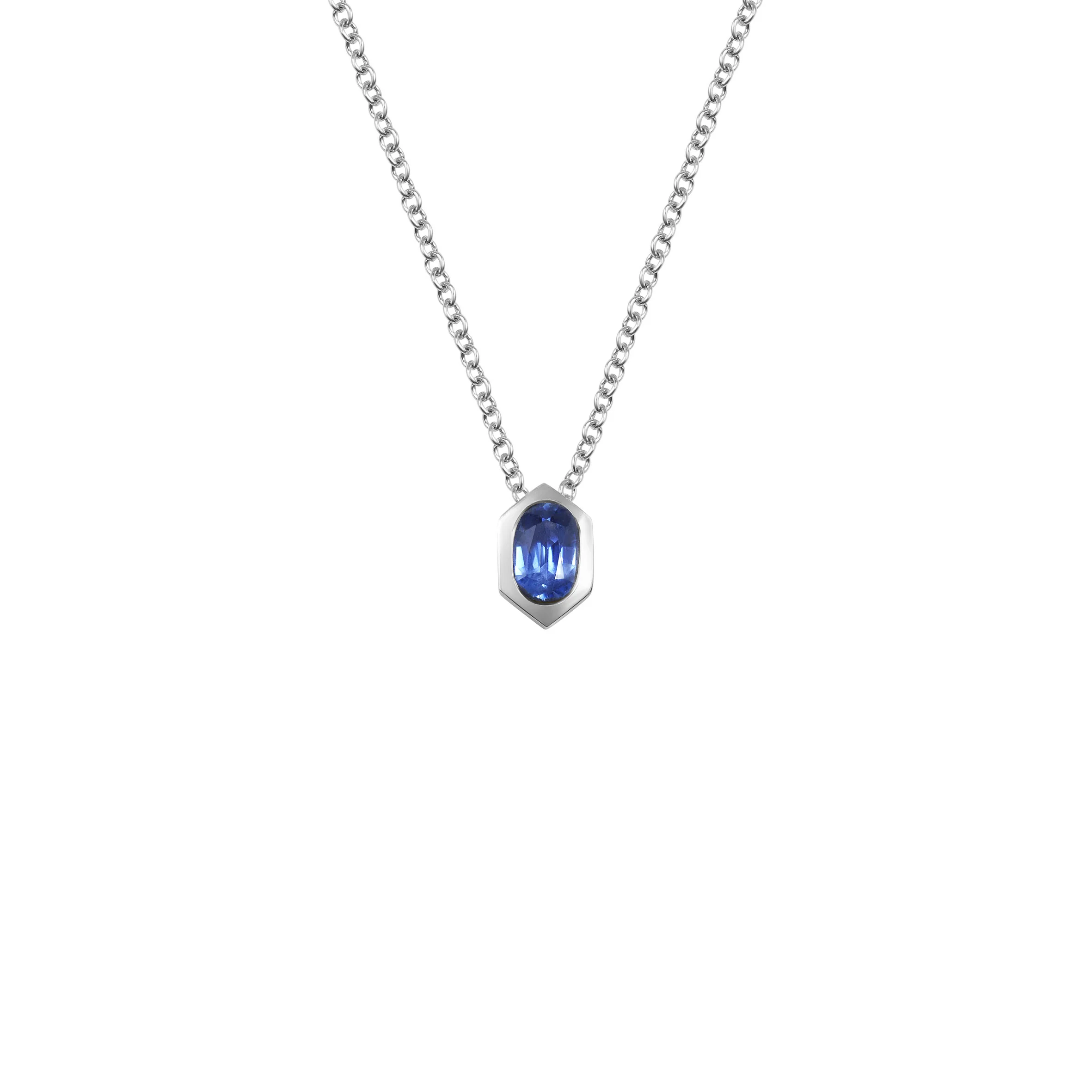 An elegant oval cut sapphire encased in our signature rubover hexagon setting - a thoughtful detail that makes this classic pendant feel truly unique.