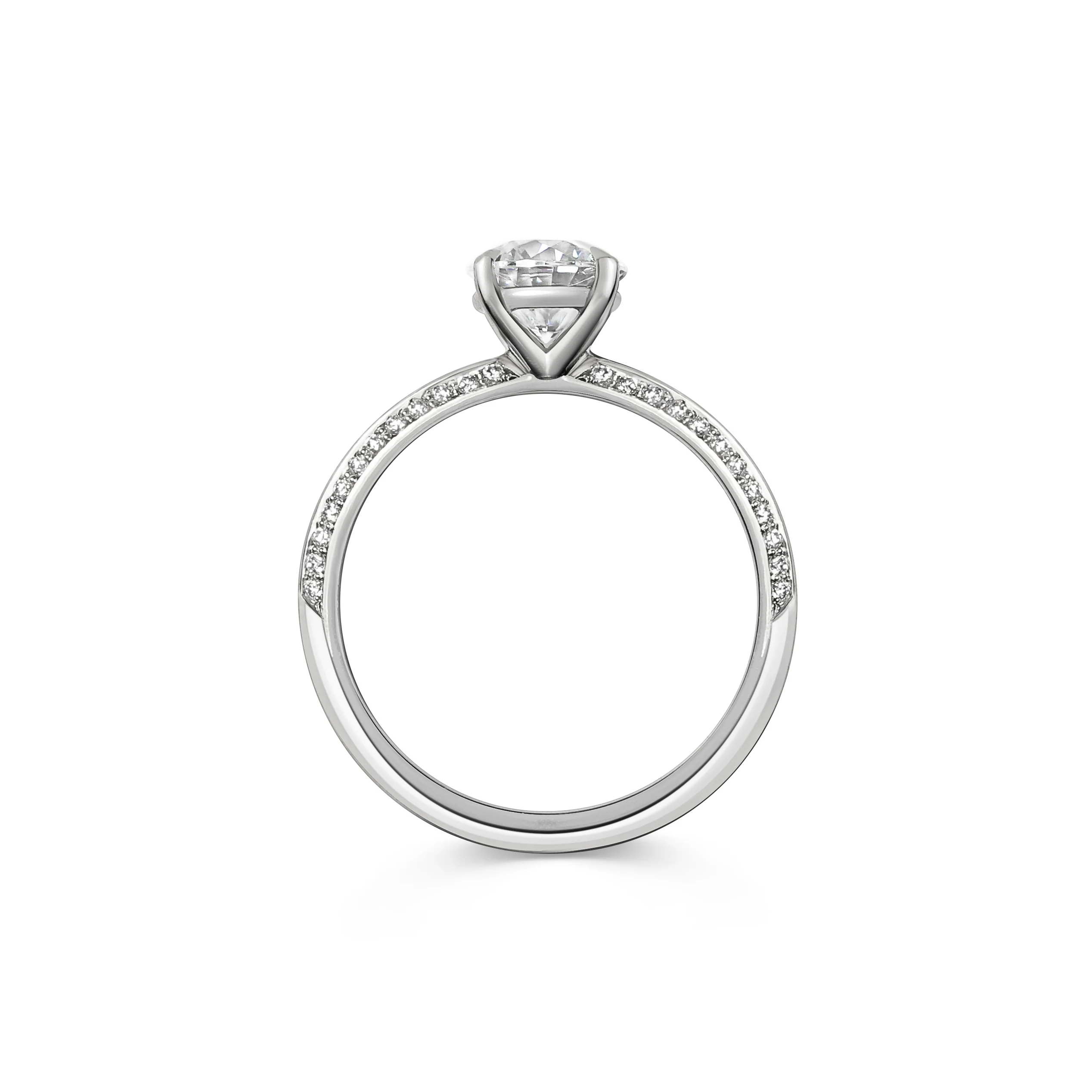 One of our more classic solitaire designs, the Ursa Major Ring features a round brilliant cut white diamond with diamonds set half way on one side of the knife-edge band. Its perfectly balanced proportions make this a beautiful and timelessly elegant piece.