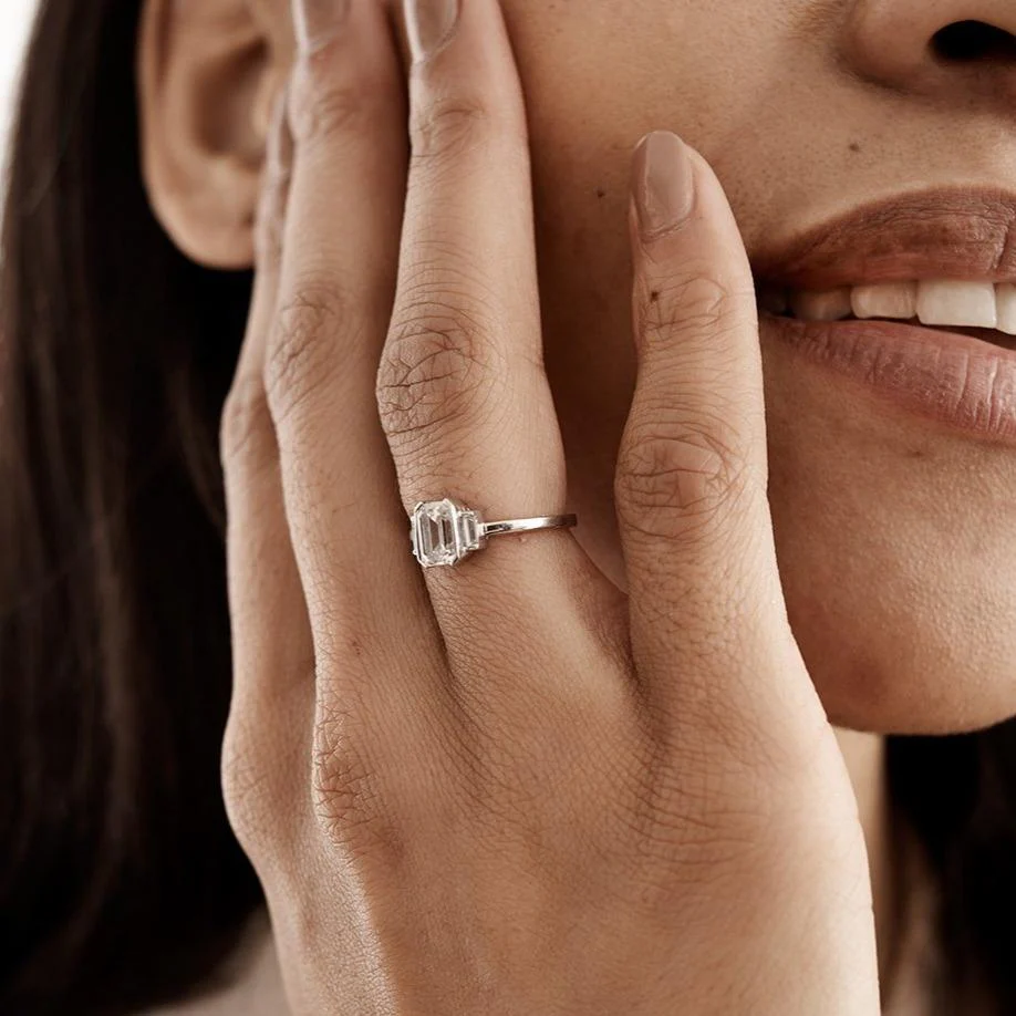 The Vela Ring is all smooth Art-Deco lines. With its stepped silhouette and sleek half-rubover setting, the Vela Ring is a little different from our other emerald cut offerings and is a classic engagement ring choice with a modern twist.